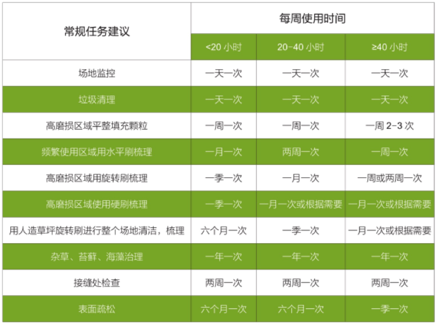 ? 無論什么情況下,定期監(jiān)測檢查能確定每個特定領(lǐng)域的日常需求。國際足聯(lián)的人造草坪保養(yǎng)指南為我們提供了一些建議和方法: