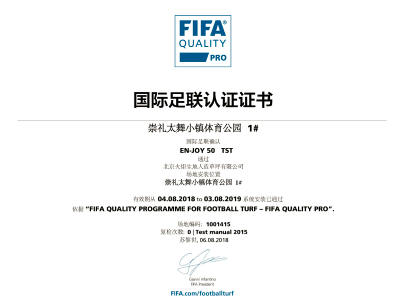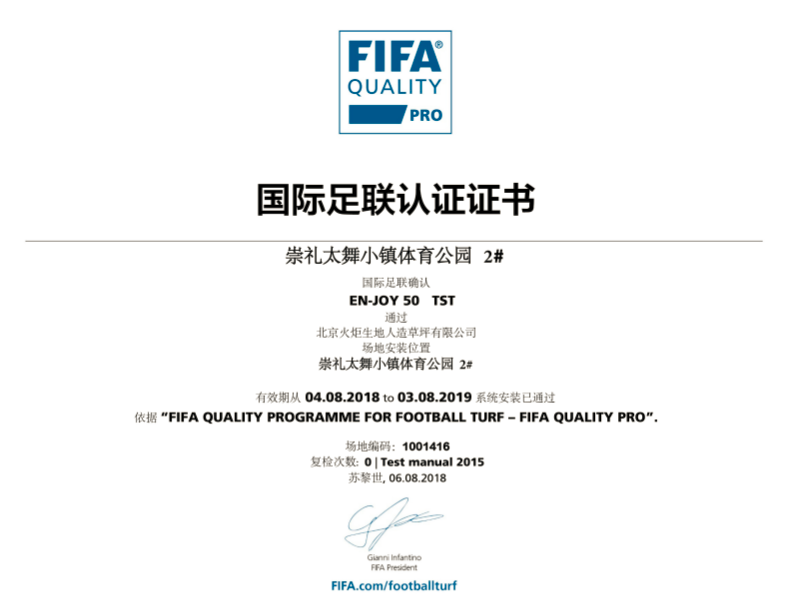 FIFA Quality Pro 是 FIFA國(guó)際足聯(lián) 認(rèn)證的標(biāo)準(zhǔn)足球場(chǎng)。獲得該證書的場(chǎng)地?fù)碛匈Y格承接FIFA賽事級(jí)別的比賽。