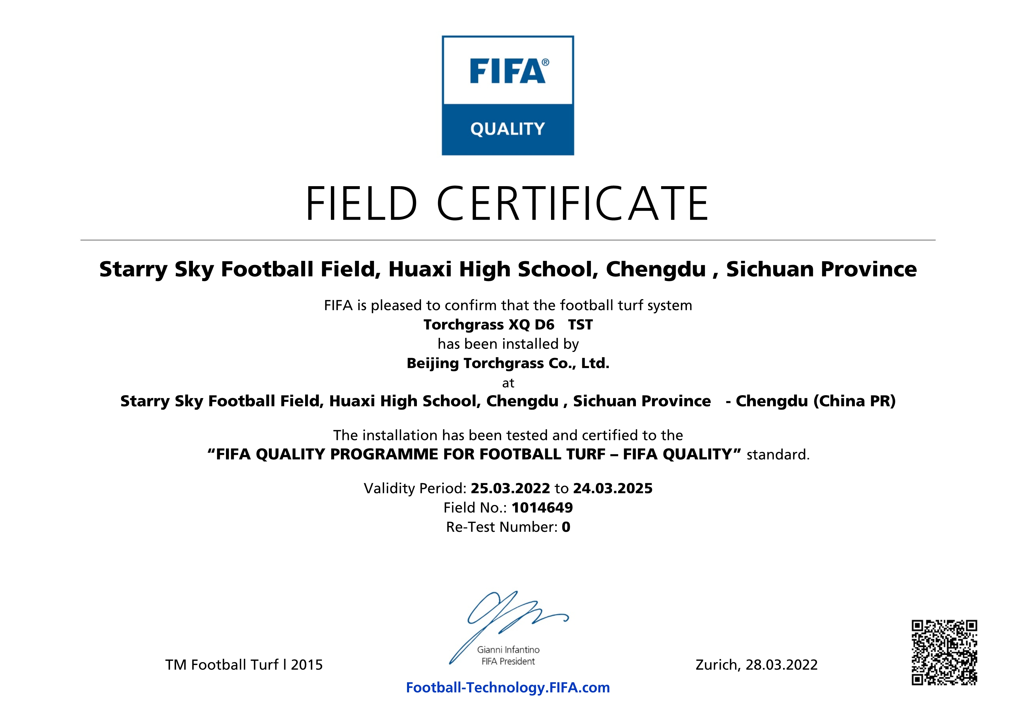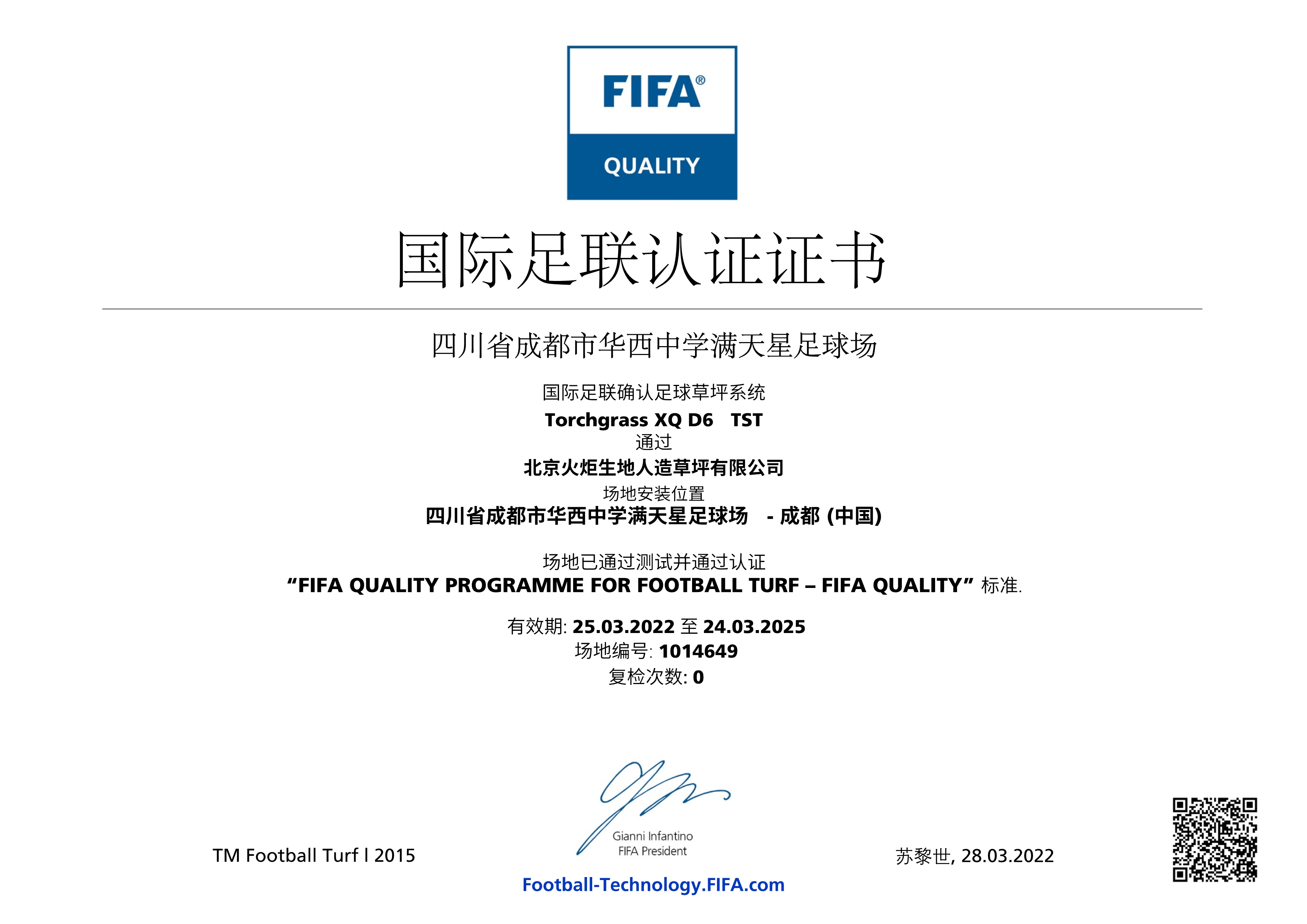 近日,四川省成都市華西中學(xué)滿天星足球場(chǎng)地已通過(guò) FIFA(國(guó)際足聯(lián))人造草坪足球場(chǎng)地質(zhì)量檢測(cè),榮獲 FIFA Quality認(rèn)證證書(shū)。