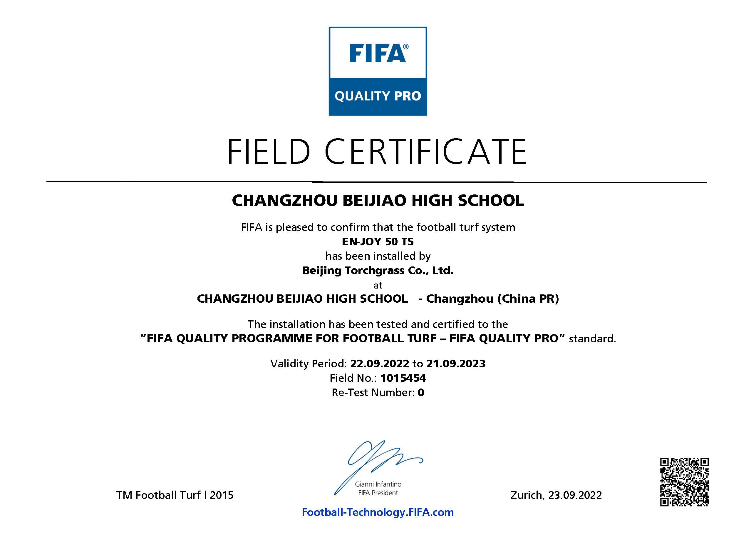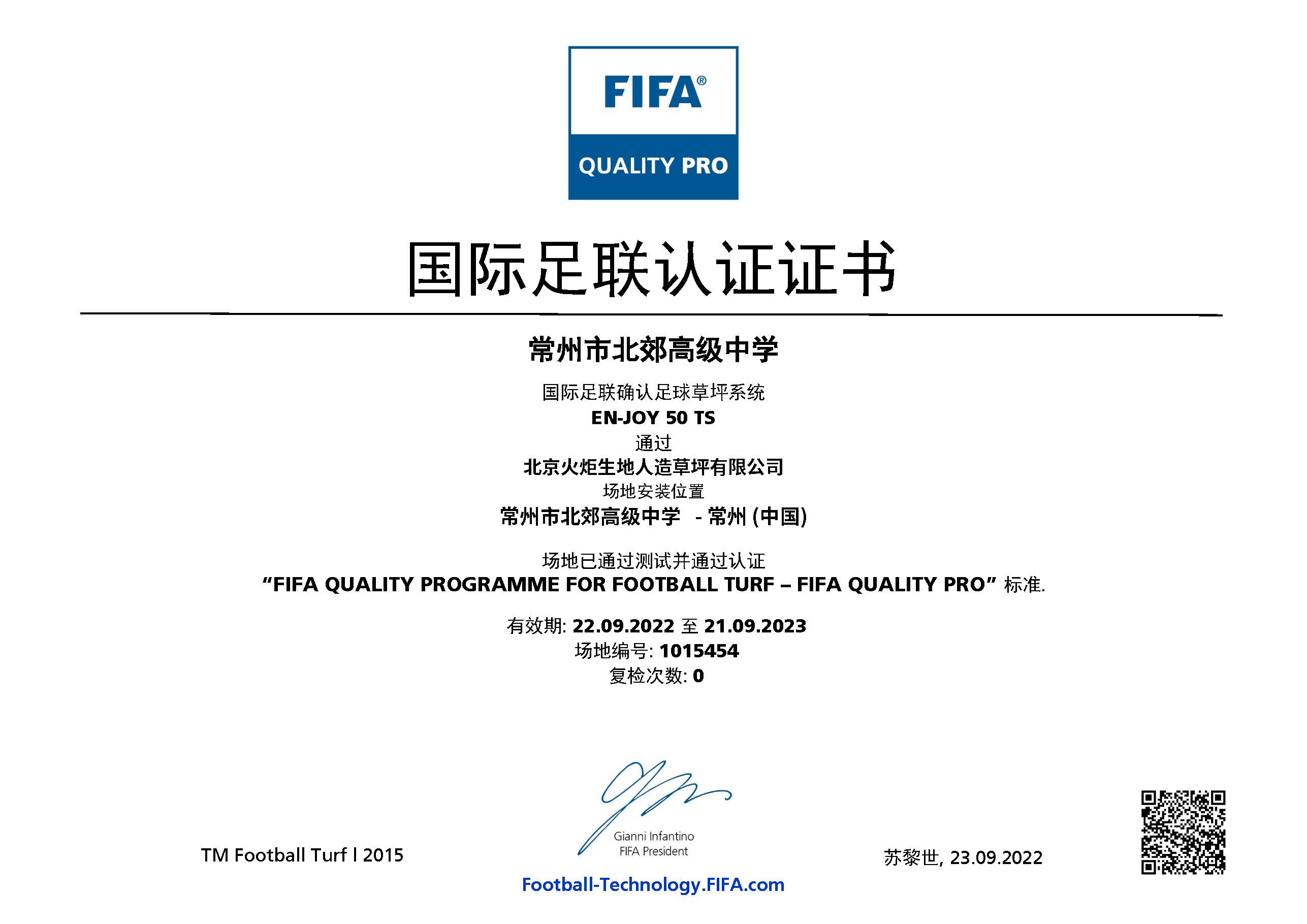 近日,常州市北郊高級中學(xué)足球場已通過 FIFA(國際足聯(lián))人造草坪足球場地質(zhì)量標(biāo)準(zhǔn)的測試,榮獲 FIFA Quality PRO認(rèn)證證書。
