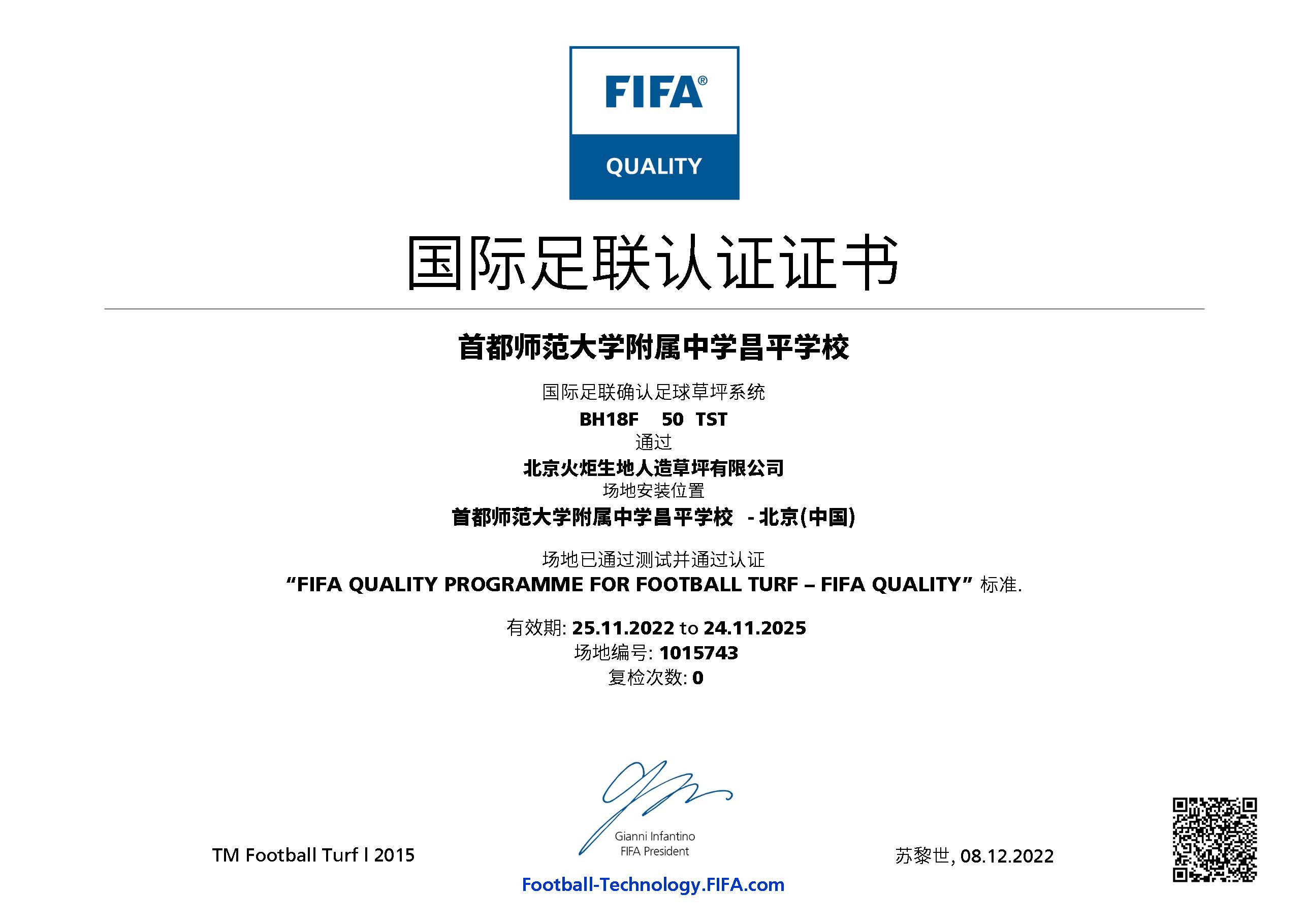 近日,首都師范大學(xué)附屬中學(xué)昌平學(xué)校足球場已通過 FIFA(國際足聯(lián))人造草坪足球場地質(zhì)量標(biāo)準(zhǔn)的測試,榮獲 FIFA Quality 認證證書。